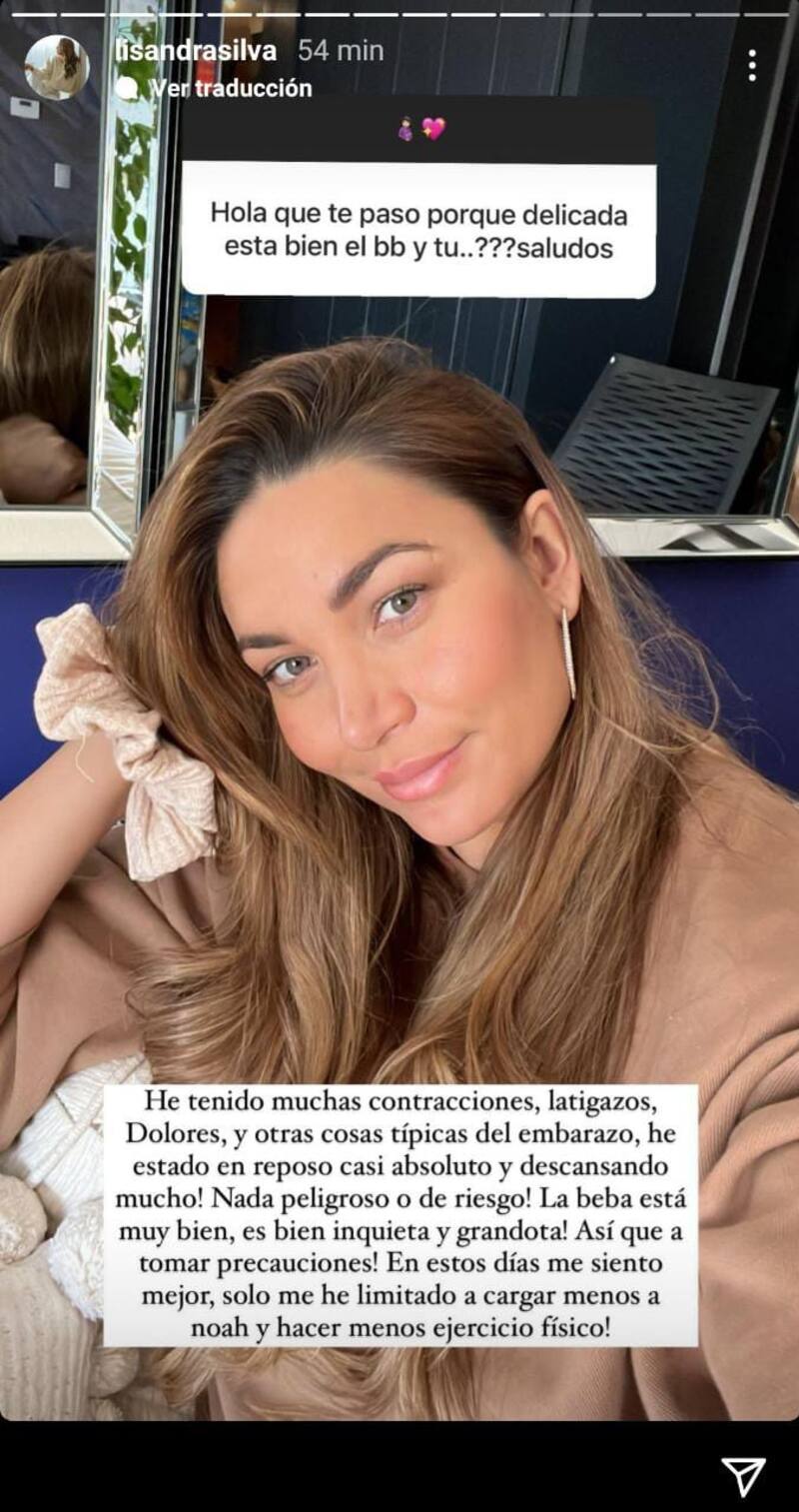 “He tenido muchas contracciones, latigazos, dolores y otras cosas típicas del embarazo. He estado en reposo casi absoluto y descansando mucho. Nada peligroso o de riesgo! La beba está muy bien, es bien inquieta y grandota! Así que a tomar precauciones. En estos días me siento mejor, solo me he limitado a cargar menos a Noah y hacer menos ejercicio físico”, agregó preocupando a sus seguidores.