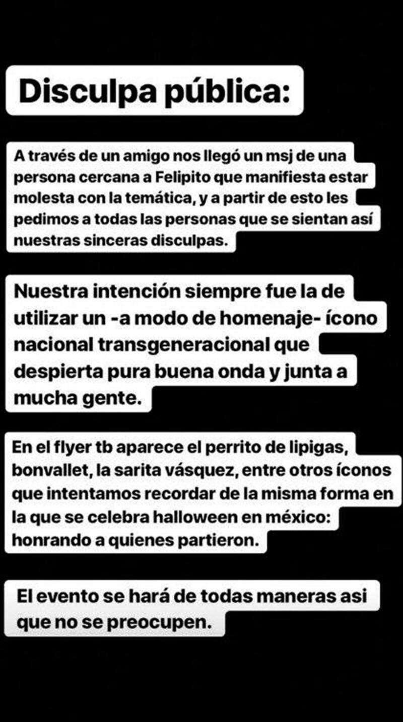 "Mediante el presente comunicado queremos pedir las disculpas pertinentes a todas las personas que se pudieron haber sentido ofendidas con la inclusión de Felipito en nuestro flyer", comienza el mensaje publicado por @ninho.indigo, quien agrega que "reiteramos nuestras intenciones de utilizar su imagen (junto con la de Sarita Vásquez, Spike, Bonvallet, etc) a modo de homenaje, al ser una figura que despierta pura buena onda y trasciende las generaciones, nunca con intenciones malitas", aclararon en la red social.