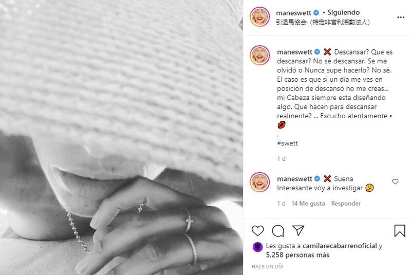 Luego, Mane Swett sigue: "El caso es que si un día me ves en posición de descanso no me creas... mi cabeza siempre está diseñando algo".