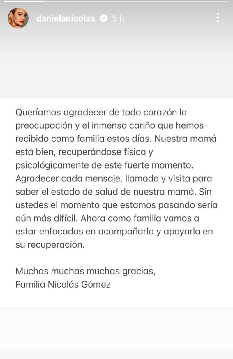 “Agradecer cada mensaje, llamado, visita para saber el estado de salud de nuestra mamá. Sin ustedes, el momento que estamos viviendo sería aún más difícil, como familia, vamos a estar enfocados en acompañarla y apoyarla en recuperación”, finalizó.