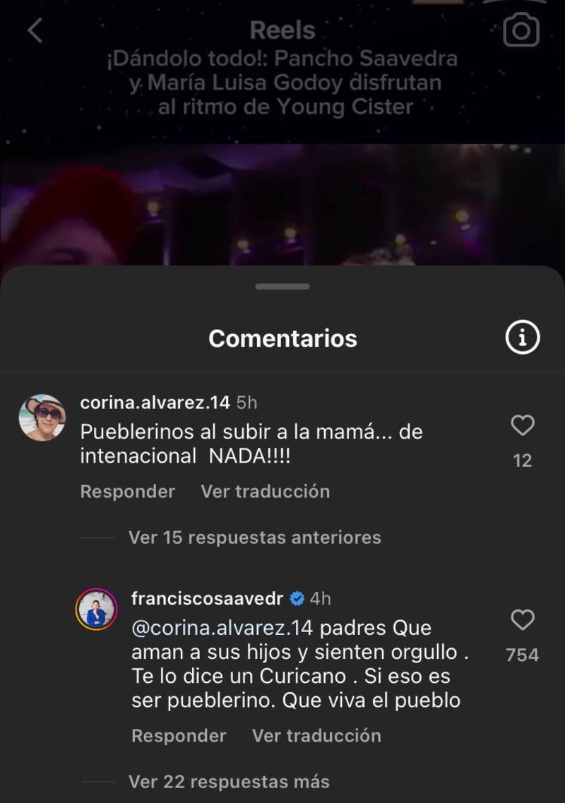 En la cuenta del animador Pancho Saavedra, en un video que compartió en el que se veía bailando junto a María Luisa Godoy, una mujer cuestionó que se subieran al escenario los padres del artista.