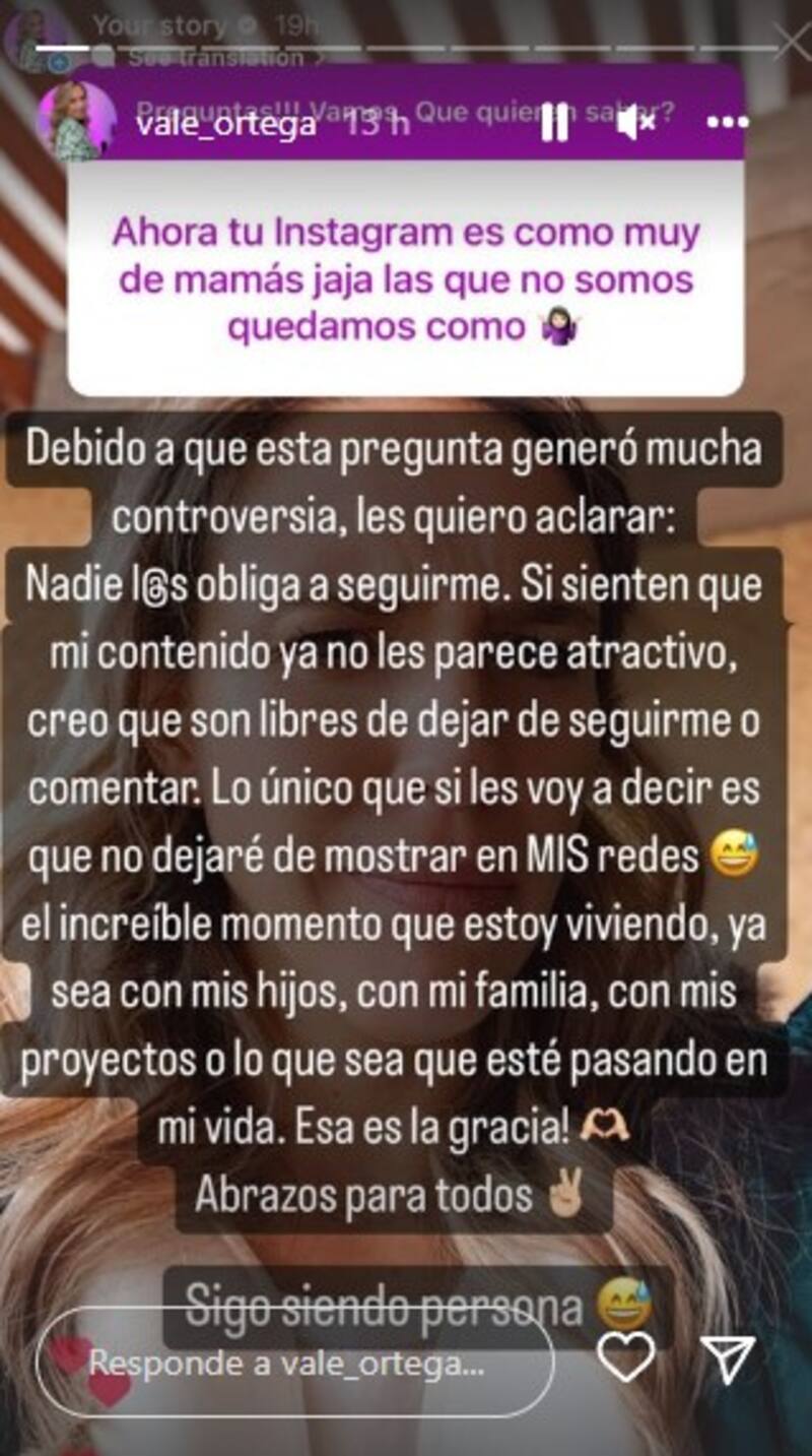 “Ahora tu Instagram es como muy de mamás jajaja las que no somos quedamos como...”, escribió con emoji como de descontento, lo que generó controversia entre sus seguidoras quienes la llenaron de mensajes de apoyo, mientras que Vale Ortega reflexionó al respecto.