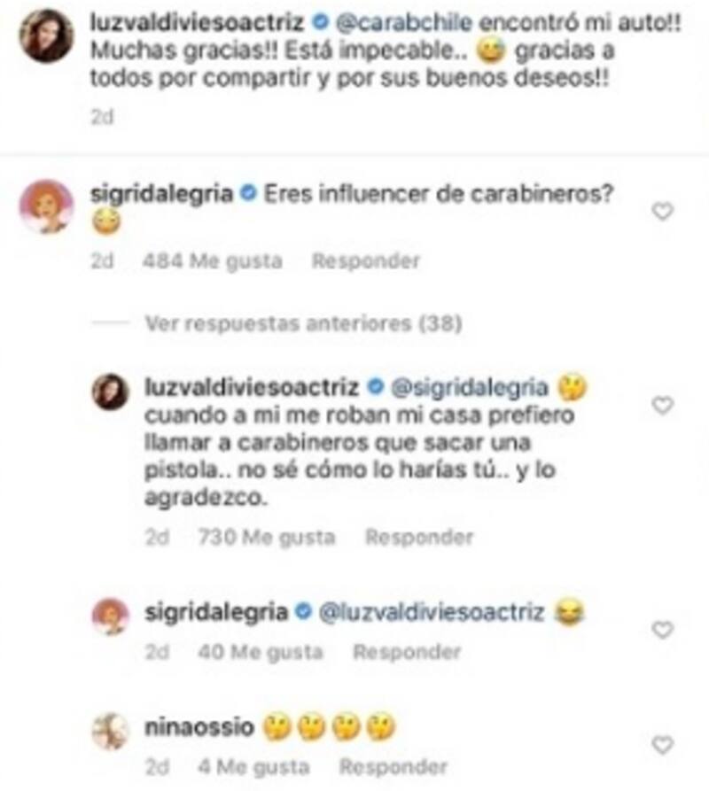 A los pocos días, Carabineros recuperó el vehículo que le sustrajeron a la actriz. Por lo mismo, Luz le agradeció a los policías tomándose una fotografía con ellos y compartiéndola en su Instagram.