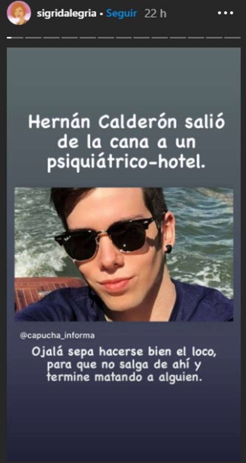«Hernán Calderón salió de la cana a un psiquiátrico-hotel. Ojalá sepa hacerse bien el loco, para que no salga de ahí y termine matando a alguien», arremetió la actriz en su cuenta de Instagram.