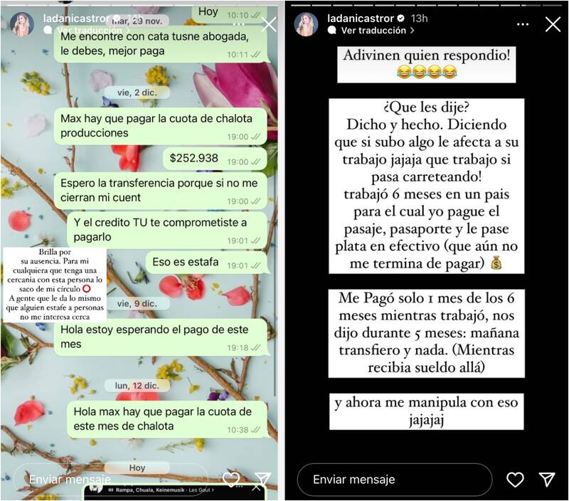 En esa misma línea, agregó: “Simplemente no contestan y siguen su vida como si nada. Somos siete personas a quienes nos debessss. Espero que conteste alguien cuando vea esta stories, es la única manera, para no perjudicar su ‘imagen’”.