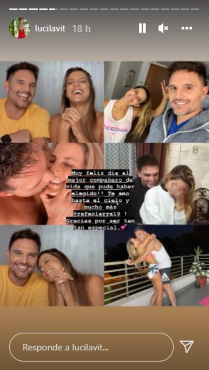 “Definitivamente la privilegiada soy yo de tenerte en mi vida, y ahí me quedo! Siempre a tu lado! Te amo mucho, feliz día mi amor”, respondió Lucila Vit, quien además compartió un tierno collage junto a Olarra en sus historias de Instagram.
