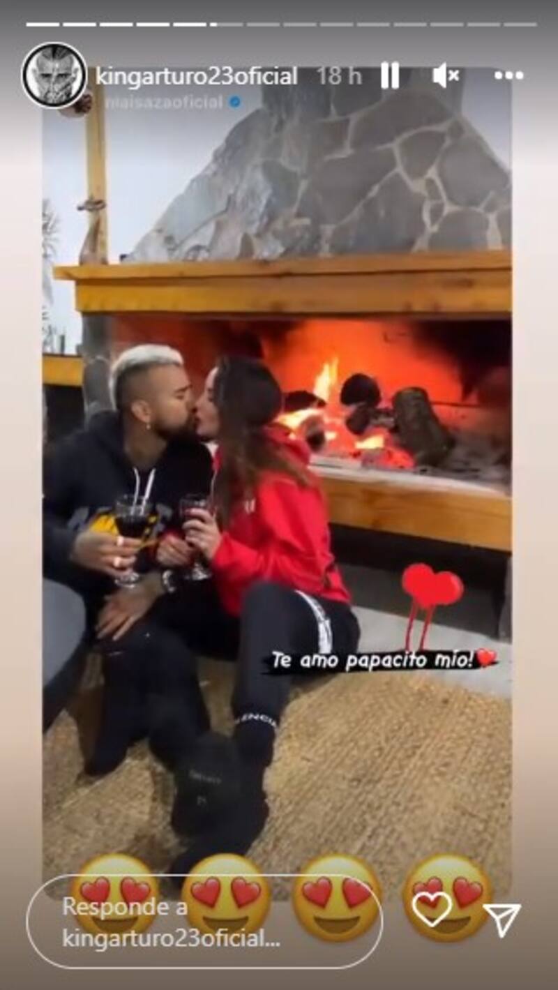 “Te amo papacito mío”, escribió la joven horas antes en sus historias donde posteó una foto junto a Vidal ambos sentados cerca de una chimenea, mientras que él reposteó el registro junto a emojis de corazones.