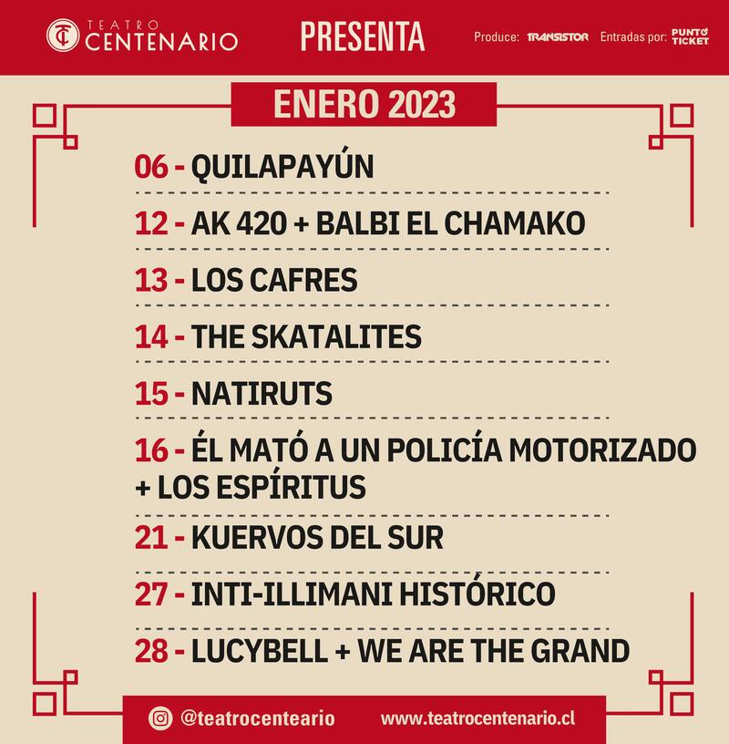 Las jornadas musicales empezarán este 6 de enero con el conjunto folklórico Quilapayún, seguido por The Skatakites el 13 y Lucybell el 28. Este será el último show de la cartelera. Las entradas estarán a la venta por el sistema PuntoTicket.