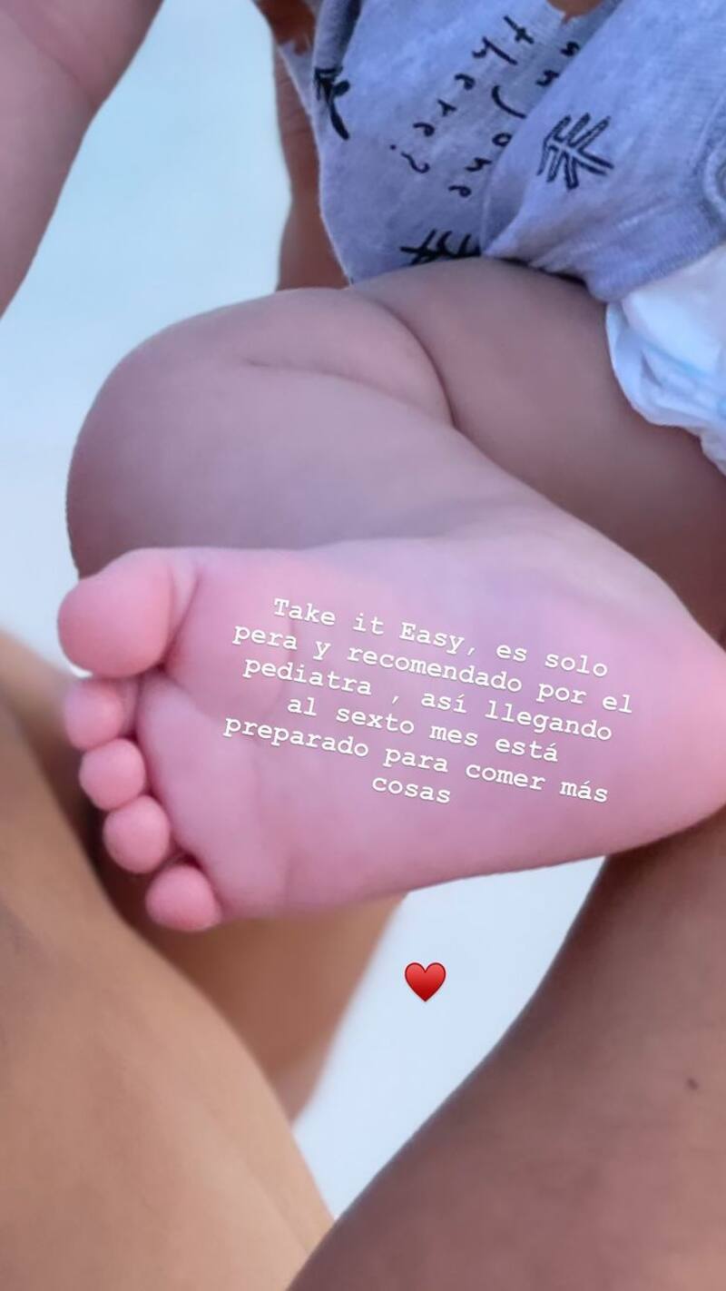 A través de sus historias de Instagram, Mayte compartió un video del bebé sentado al aire libre en su silla para comer. La actriz escribió que “con cinco meses hoy probó su primera fruta”, destacando que sería una pera.