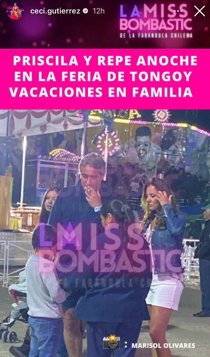 En la imagen, aparecen ambos junto a sus hijos disfrutando de un agradable momento durante la noche del sábado. “Priscilla y Repe anoche (sábado) en la feria de Tongoy. Vacaciones en familia”, escribió la periodista de espectáculos en la mencionada plataforma virtual.