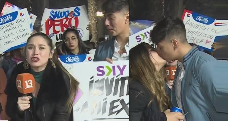“Estos carteles son dignos de un ‘amigo date cuenta’. Miren, por favor”, anunció la periodista de Canal 13, Pía Pérez, mientras indicaba los letreros que ambos tórtolos mostraban.