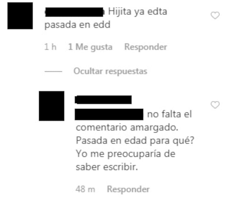 Sin filtro, una seguidora le escribió "Hijita, ya está pasada en edad", pero como era de esperar, el ácido comentario de llenó de respuestas, en defensa de la animadora.