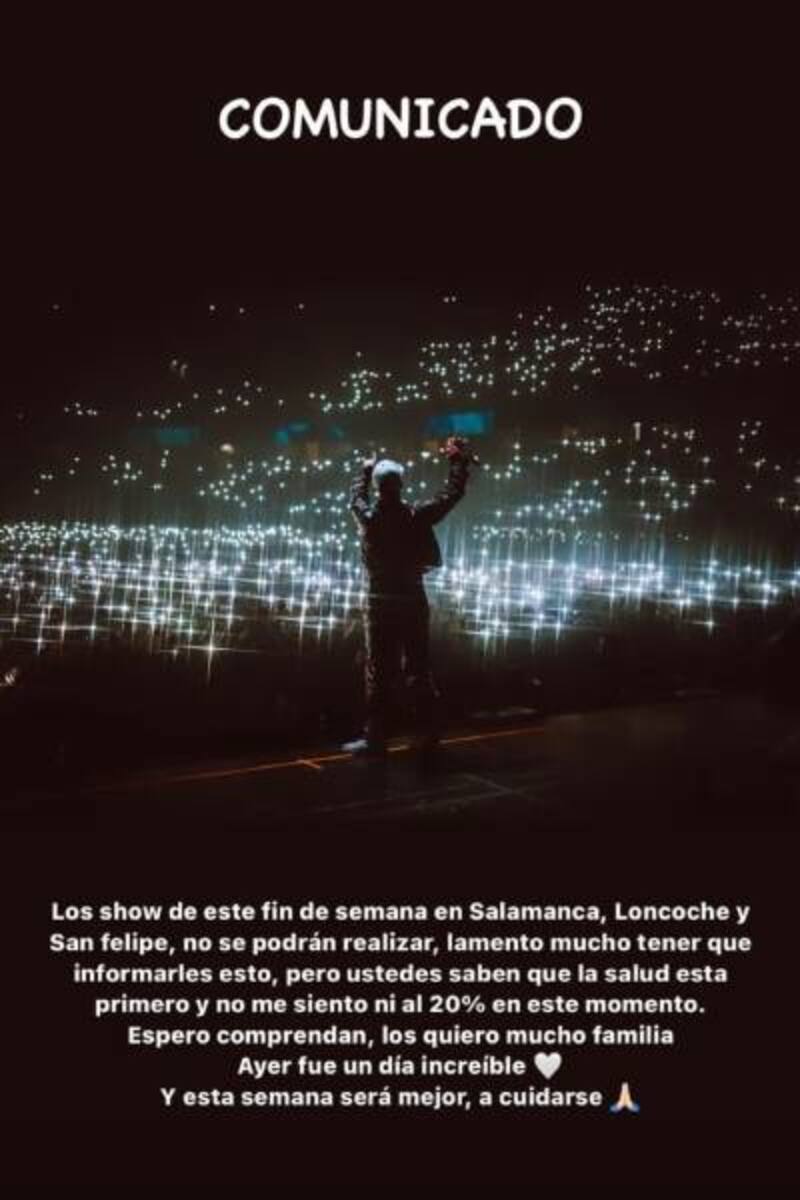 “Los show de este fin de semana en Salamanca, Loncoche y San Felipe, no se podrán realizar. Lamento mucho tener que informarles esto”, explicó.
