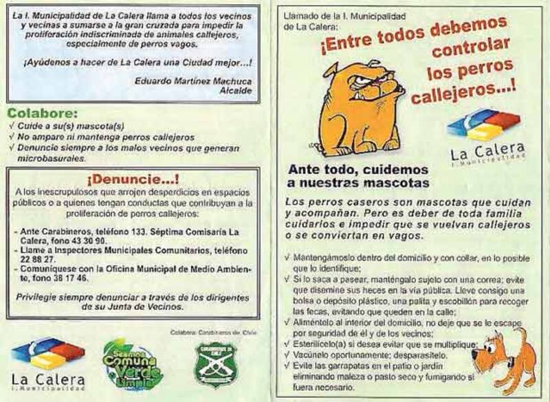 "el alcalde (Eduardo Martínez) ha ido a radios locales y repartiendo folletos para que no se alimente a los perros de la calle y si lo hacen se va a cobrar una multa de 80 mil pesos, todo esto, según él, para hacer que baje la sobrepoblación de perros en la comuna"