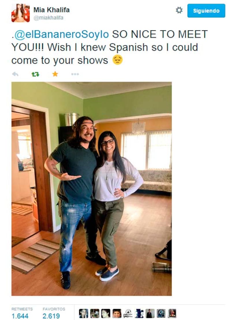 "El Bananero", personalidad cibernética del charrúa Adrián Nario, subió en Twitter una foto con Mia Khalifa (21 pepas), y altoque fue la envidia de la ciberbarra nacional y foránea.