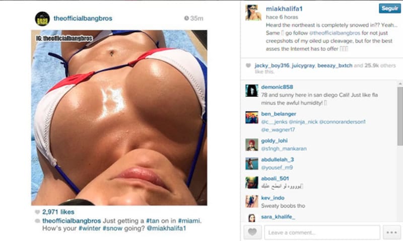 En la Instagram oficial de BangBros, sitio web cochino, se subió una infartante foto de la guapa diosa, a lo que ella mismita se rajó con replicarla en su propia red social de imágenes.