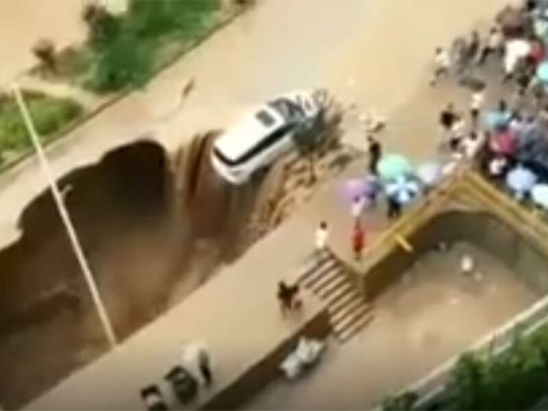 Tal cual, porque las fuertes lluvias que han causado inundaciones en casi todo el país asiático, provocó la aparición de un emorme hoyo en la vía.