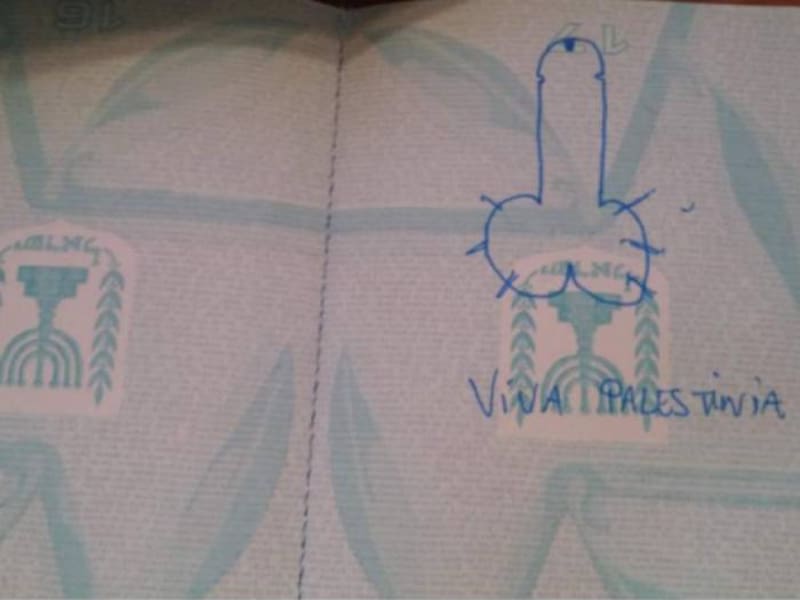 También denuncia que, además del dibujo, este también habría escrito "Larga vida a Palestinia"en el documento. Según su denuncia, el hecho habría ocurrido en el 2015, cuando cruzaba de Argentina a Chile.