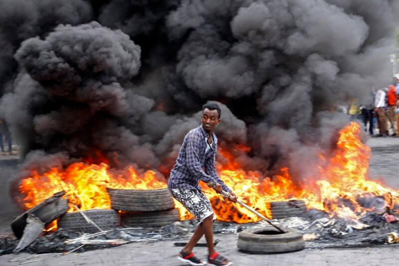 Hombre somalí protesta contra quemando neumáticos y exigiendo justicia tras el asesinato de un civil durante el toque de queda nocturno, el cual tiene como objetivo frenar la propagación del coronavirus. Mogadiscio, Somalía. (Foto: AP/Farah Abdi Warsameh)[/caption]