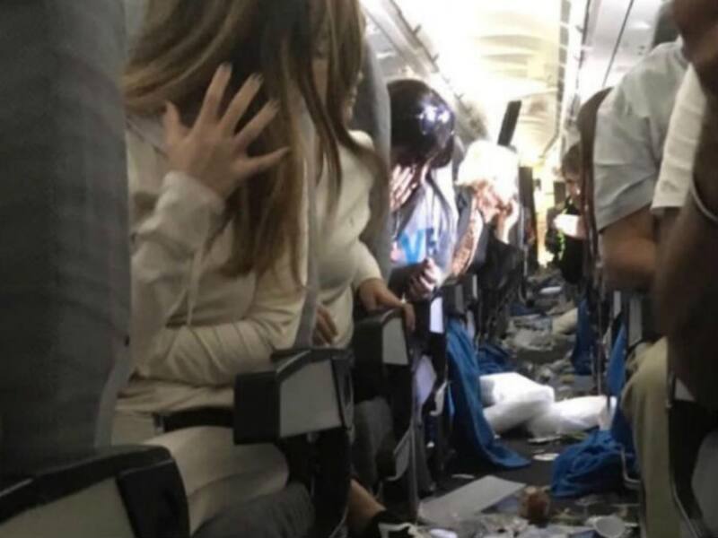Fotografías y filmaciones de los pasajeros poco después del incidente muestran la cabina regada de restos de comida y destrozos.