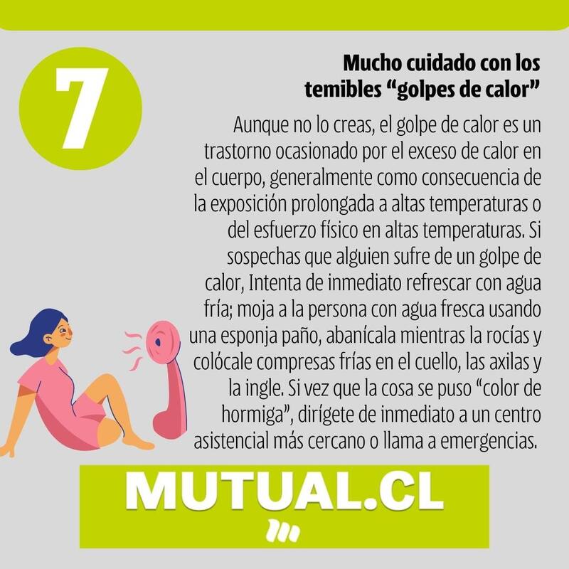 Síntomas como fatiga, dolor de cabeza, mareos, falta de apetito, insomnio, calambres o en casos extremos, lesiones en la piel, son algunos de los que podemos sufrir si no nos ponemos “vivaldis” y nos cuidamos del “care´gallo”. Por eso Mutual de Seguridad junto a La Cuarta te entregan las 7 claves para protegerte de los Rayos UV y las altas temperaturas.