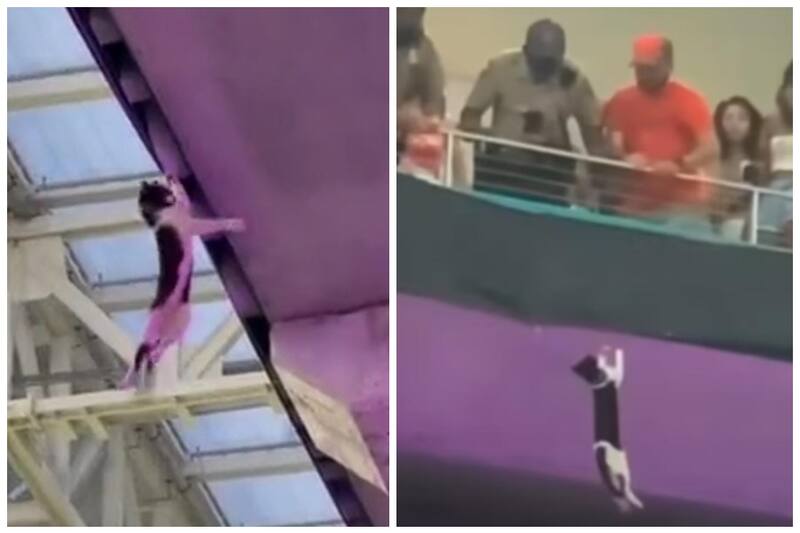 ¡Impacto!: Gato fue rescatado intacto entre gritos y aplausos tras caer 20 metros desde el techo de un estadio