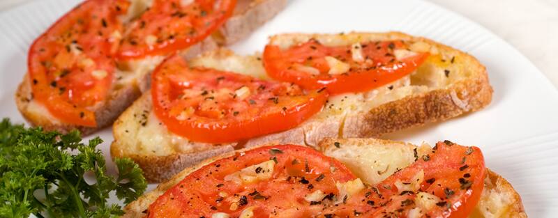 - Colocar las tostadas en una fuente o en platos individuales. Con una cuchara, untar una cucharada colmada de puré de tomate sobre cada tostada. A continuación, colocar las rodajas de tomate y los tomates cherry al azar en la parte superior.