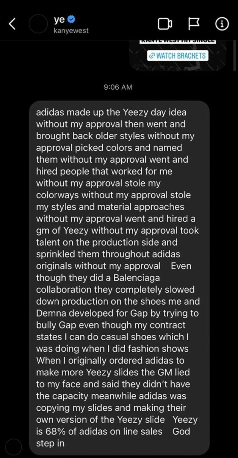 “Cuando originalmente pedí más sandalias de Yeezy, el GM me mintió en la cara y me dijo que no tenían la capacidad, pero después Adidas estaba copiando mis sandalias”, lanzó.