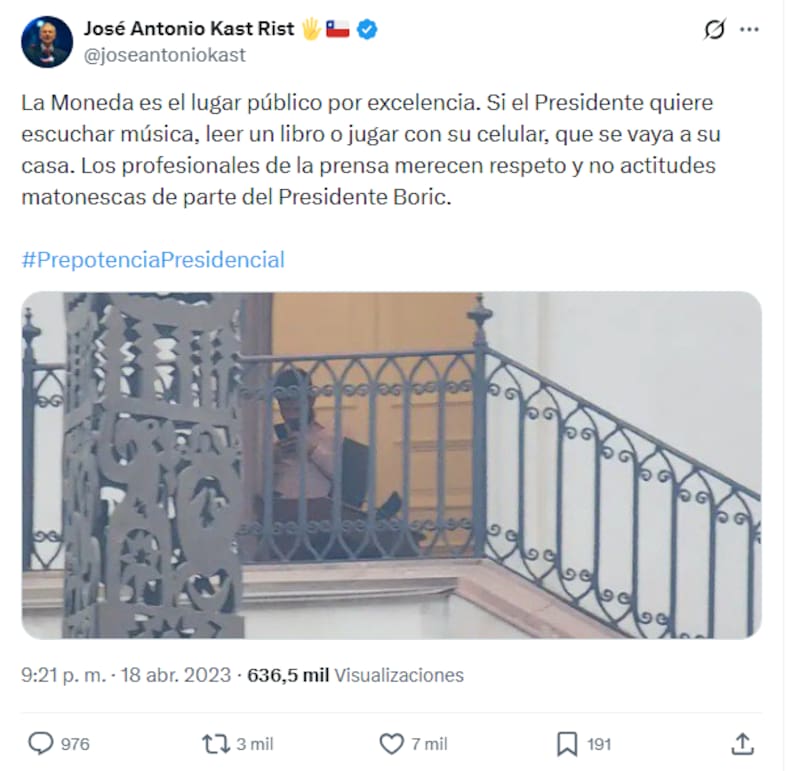 Esa vez, Kast aprovechó la noticia de que Boric había increpado a un fotógrafo por capturarlo al interior de su oficina en La Moneda y en las fotos se le veía con el celular en la mano.