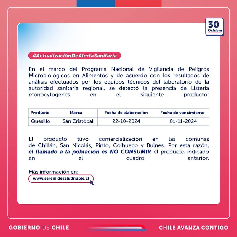 A través de un nuevo comunicado, el Seremi de Salud de Ñuble comunicó la presencia de Listeria monocytogenes en un nuevo producto que tuvo comercialización en las comunas de Chillán, San Nicolás, Pinto, Bulnes y Coihueco.