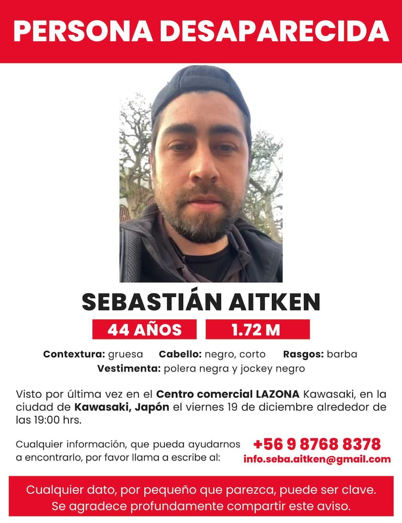 Sebastián Aitken tiene más de 20 años de residencia en Japón. Su familia realizó un urgente llamado a colaborar en la búsqueda.
