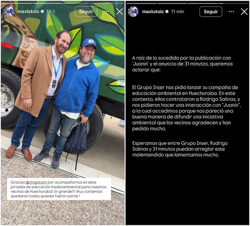 “A raíz de lo sucedido por la publicación con Juanín y el anuncio de 31 Minutos, queremos aclarar que: El Grupo Inser nos pidió lanzar una campaña de educación ambiental en Huechuraba”, detalló.