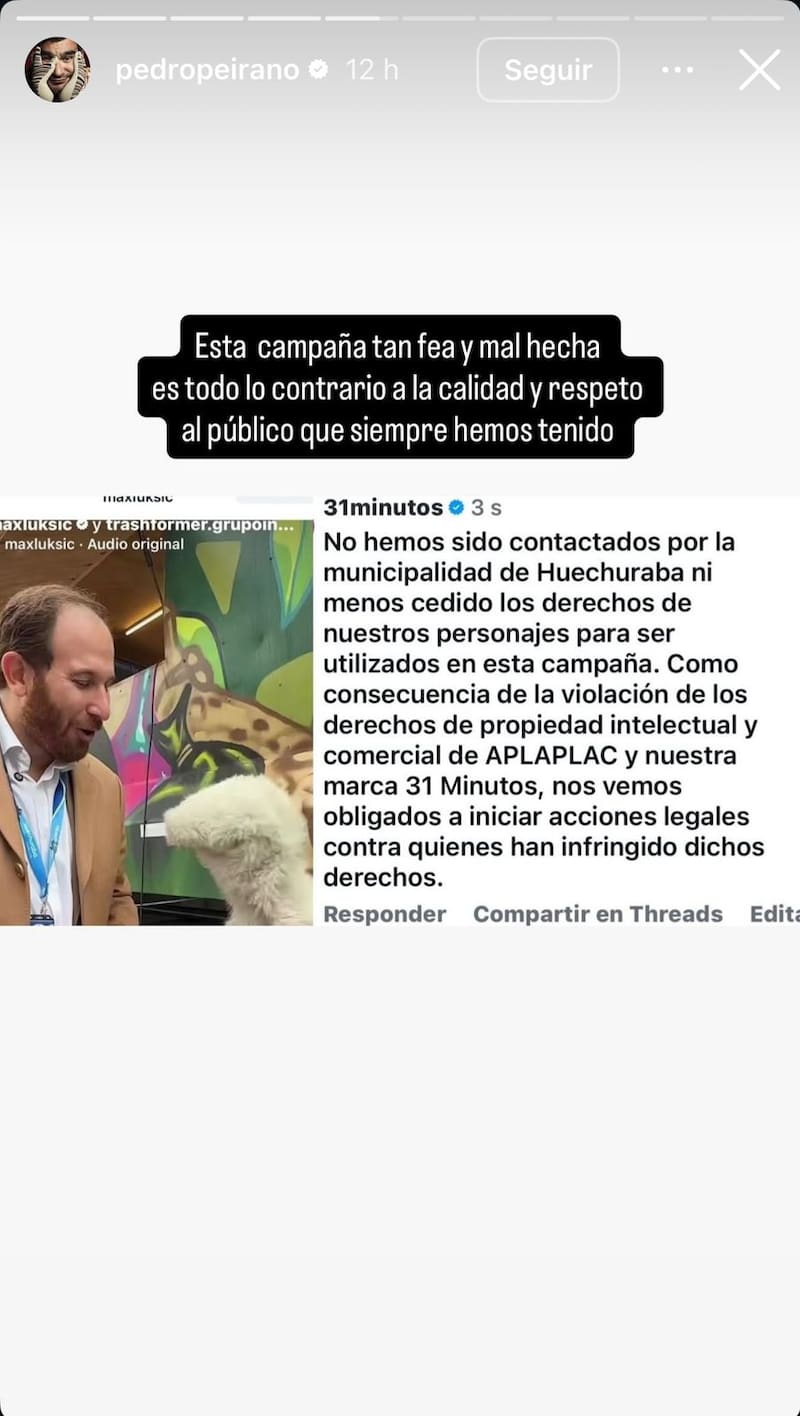 Por su lado, Pedro Peirano, uno de los creadores del reconocido programa infantil, también se refirió a lo ocurrido en sus historias de Instagram. “Esta campaña tan fea y mal hecha es todo lo contrario a la calidad y respeto al público que hemos tenido”, expresó.