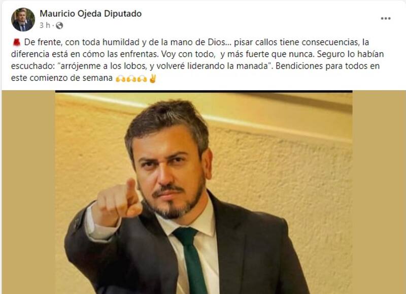 “De frente, con toda humildad y de la mano de Dios… pisar callos tiene consecuencias, la diferencia está en cómo las enfrentas. Voy con todo, y más fuerte que nunca. Seguro lo habían escuchado: ‘arrójenme a los lobos y volveré liderando la manada’”, escribió el parlamentario.