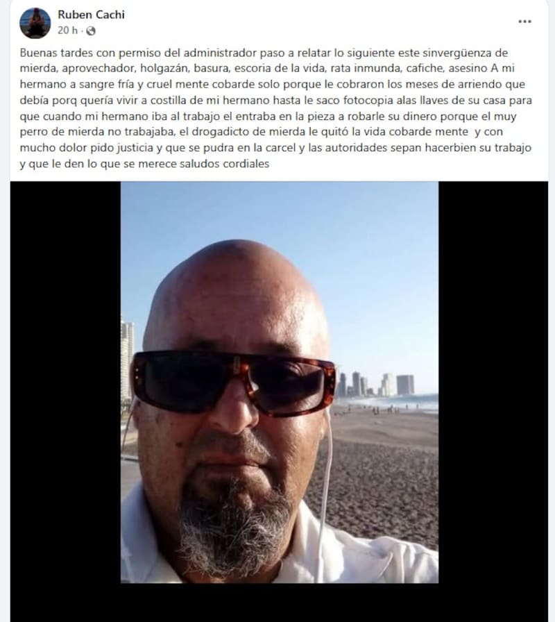 “El muy perro de mierda no trabajaba, el drogadicto de mierda le quitó la vida cobardemente. Con mucho dolor pido justicia y que se pudra en la cárcel, y que las autoridades sepan hacer bien su trabajo y le den lo que se merece", cerró.