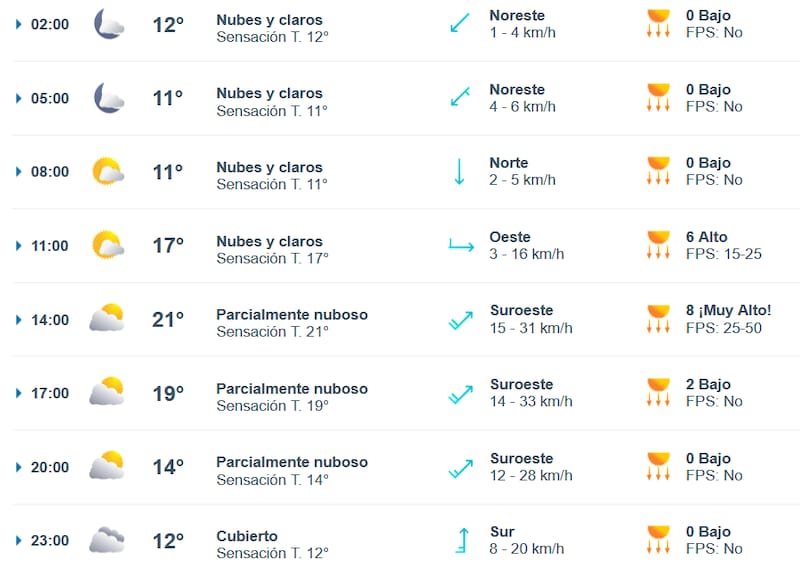 Las temperaturas oscilarán entre 10°C y 21°C durante el dia, cuya máxima se alcanzará sobre las 14:00.