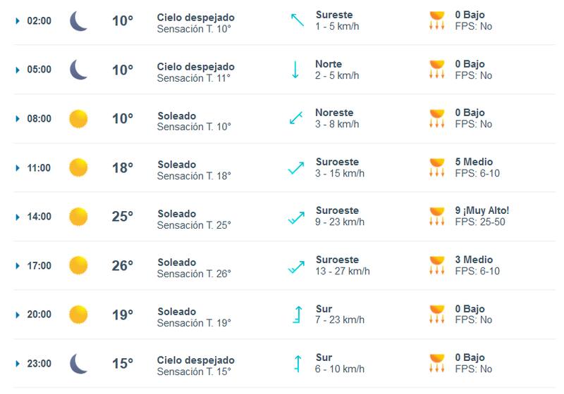 - A lo largo del día prevalecerá el viento moderado de oeste, con rachas que podrán llegar hasta 32 km/h por la tarde.
