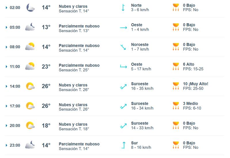 - A lo largo del día prevalecerá el viento moderado de oeste, con rachas que podrán llegar hasta 32 km/h por la tarde.