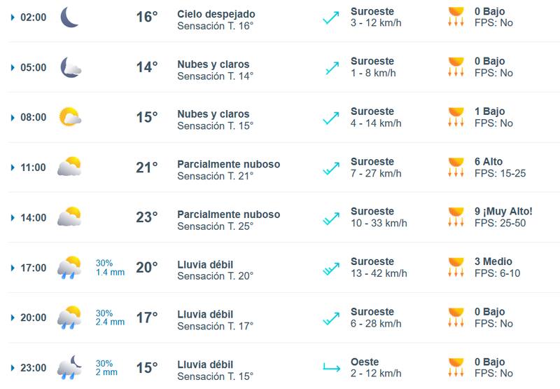 - A lo largo del día prevalecerá el viento moderado de suroeste, con rachas que podrán llegar hasta 32 km/h por la tarde.