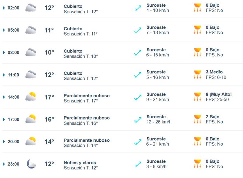Las temperaturas oscilarán entre 10°C y 18°C durante el dia, cuya máxima se alcanzará sobre las 15:00.