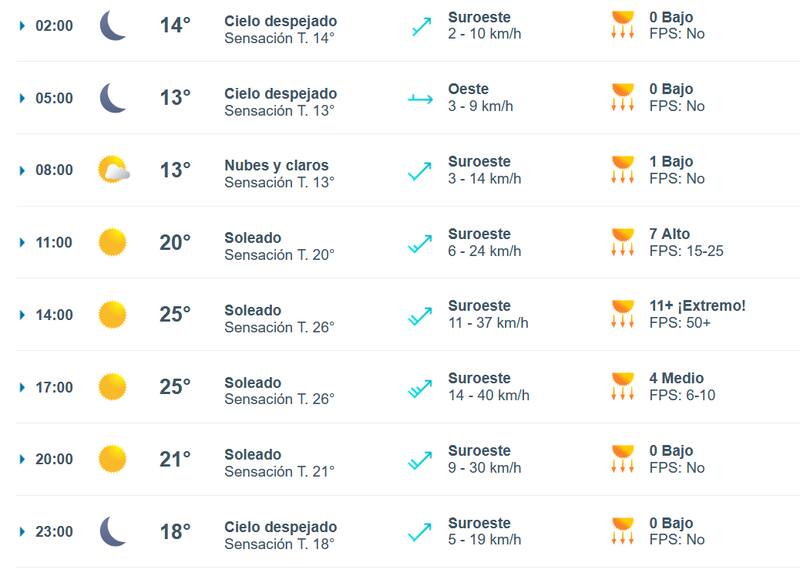 - A lo largo del día prevalecerá el viento moderado de sur, con rachas que podrán llegar hasta 42 km/h por la tarde.