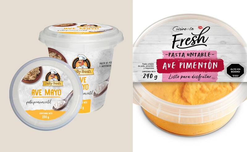 Pasta untable ave pimentón refrigerada 240 gr. (Cuisine&Co), Slice de trucha ahumada en frio refrigerada (Cuisine&Co), Pasta ave mayo premium coctel refrigerada (Daily Fresh) y Pasta untable club, jamón, mayonesa, pepinillo (Cuisine&Co).