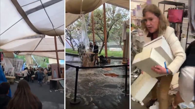 Pero tal como recogieron diversas imágenes publicadas en redes sociales, la carpa simplemente colapsó, obligando a los participantes de la feria a salir rápidamente para no quedar empapados, pero también tratando de cuidar sus productos de una inminente inundación.