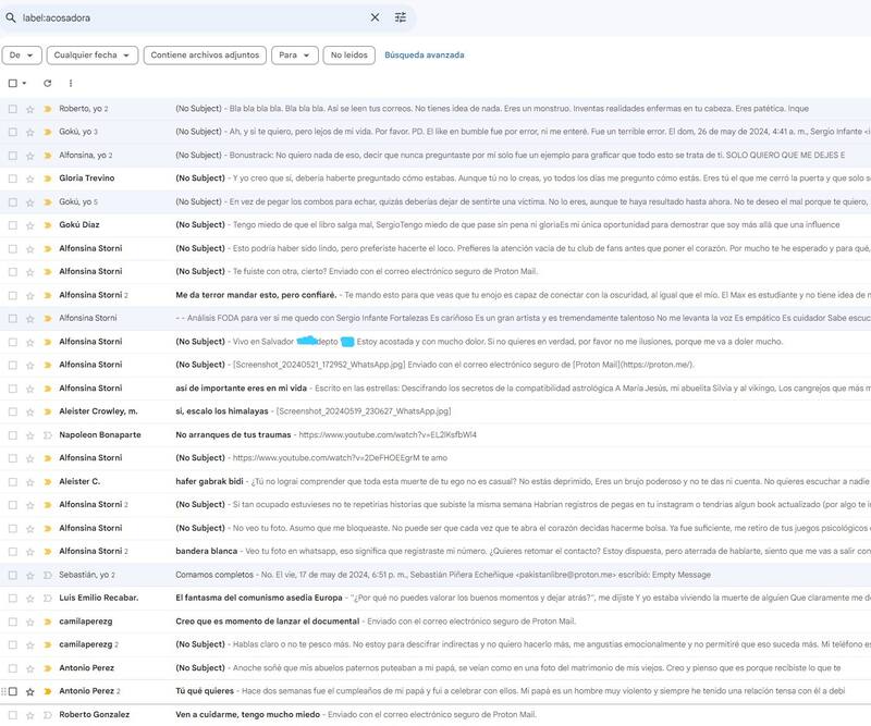 En la carpeta investigativa se adjuntó como prueba un “pantallazo” de la bandeja de mensajes en donde se listan una serie de e-mails que habrían sido enviados por Miau Astral.