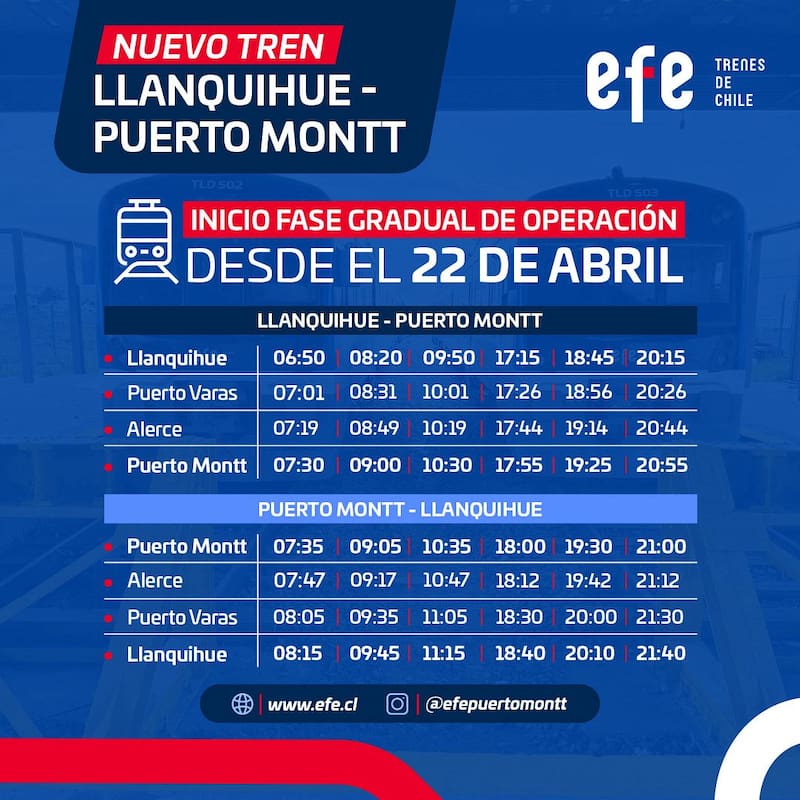 Según informó EFE, la operación inicial será progresiva, con horarios diarios y paradas en Puerto Varas y Alerce, además de las estaciones terminales.