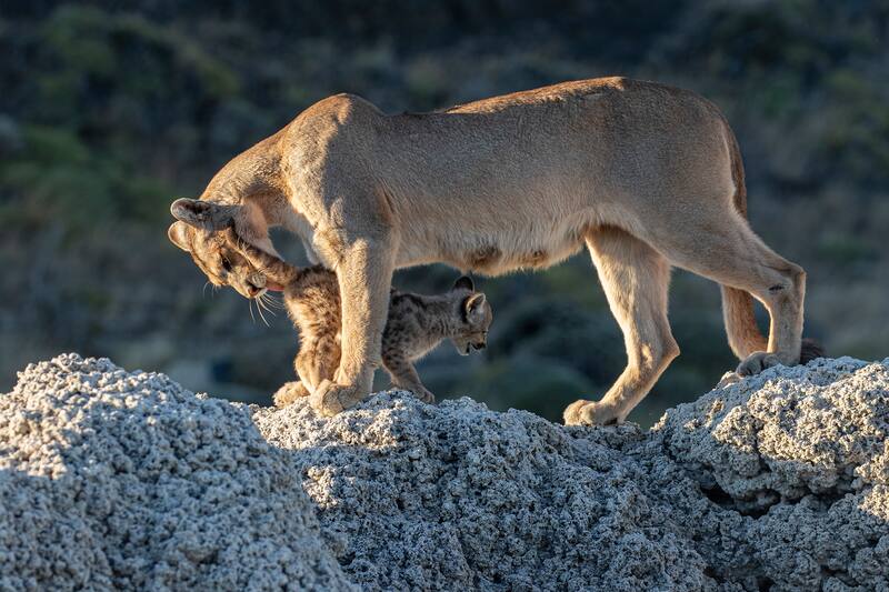 ¿Mi foto favorita a un puma? Difícil escoger la favorita, pero creo que más que por la foto, por el momento vivido, una de mis favoritas puede ser la foto de portada de la segunda edición del libro, donde se muestra a “Rupestre” con sus cachorros, descansando plácidamente al atardecer. Para quienes estuvimos ahí en ese momento (Vicente, John y yo), la foto muestra exactamente lo que vivimos en ese momento. Habremos estado una hora avistando a esa familia, en un momento que fue tan tranquilo, contemplando y sintiendo una paz que sólo ese atardecer y ese momento nos pudieron entregar.