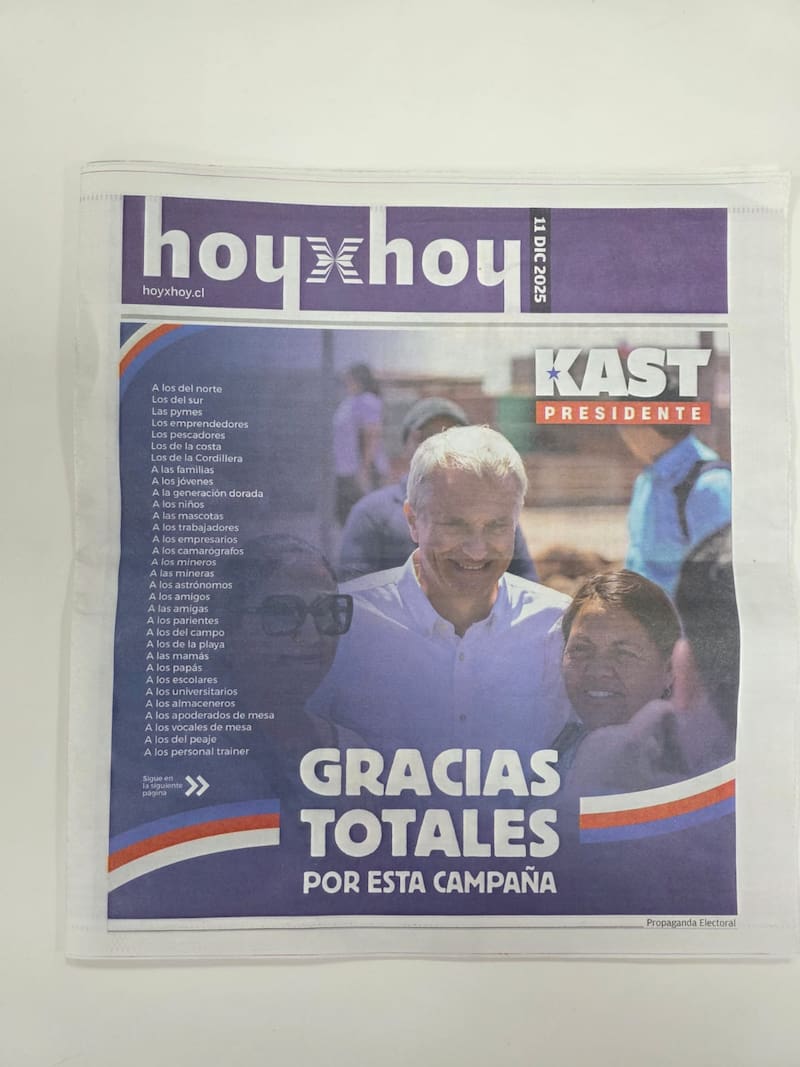 Una propaganda política a página completa para la campaña de José Antonio Kast marcó a la más reciente edición del diario HoyxHoy.