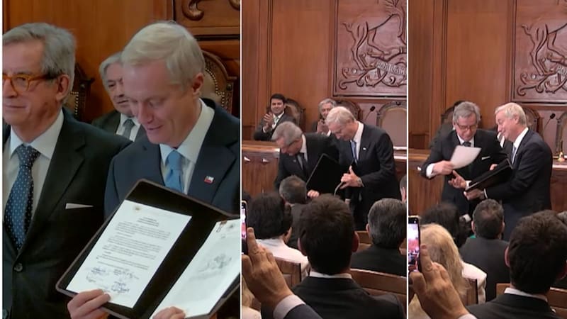 En ese momento, Kast abrió la carpeta para exhibir los documentos y los papeles salieron volando. El presidente del Tricel tuvo que recogerlos, entre gestos y sonrisas incómodas de todos los presentes.