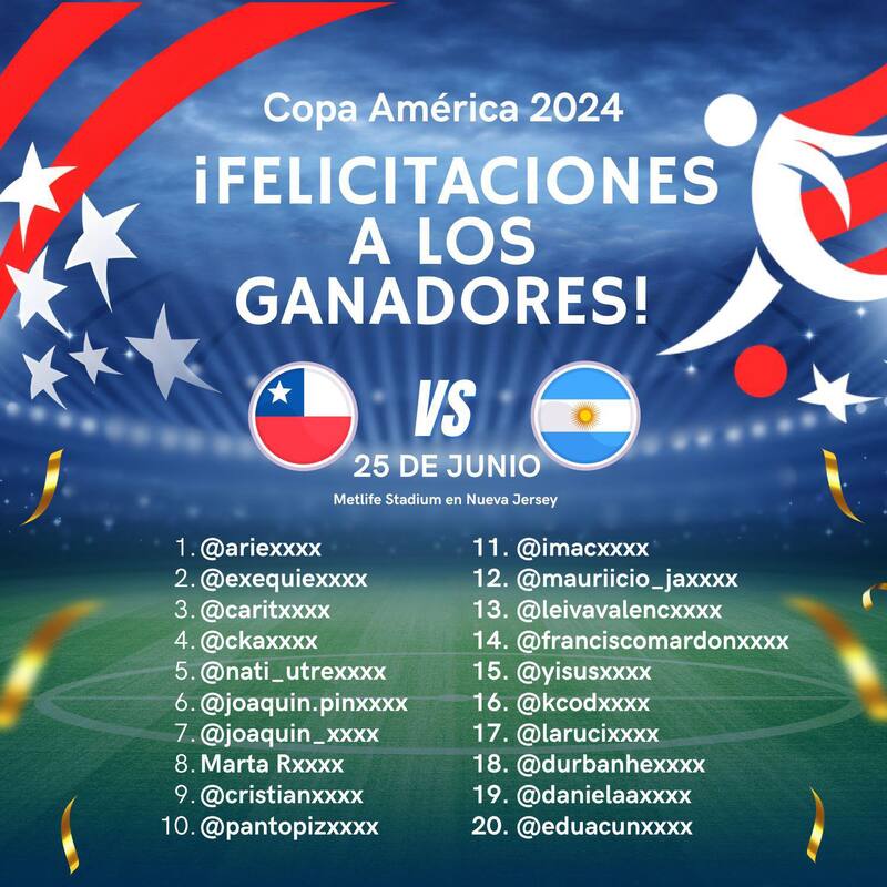 “¡Buena semana para todos! ¡A continuación les comparto la lista de los 20 ganadores del sorteo Copa América! Espero que todos ustedes, junto a su acompañantes, tengan una gran experiencia en Estados Unidos, alentando a la Roja con todo el corazón”, expresó el magnate en sus redes.