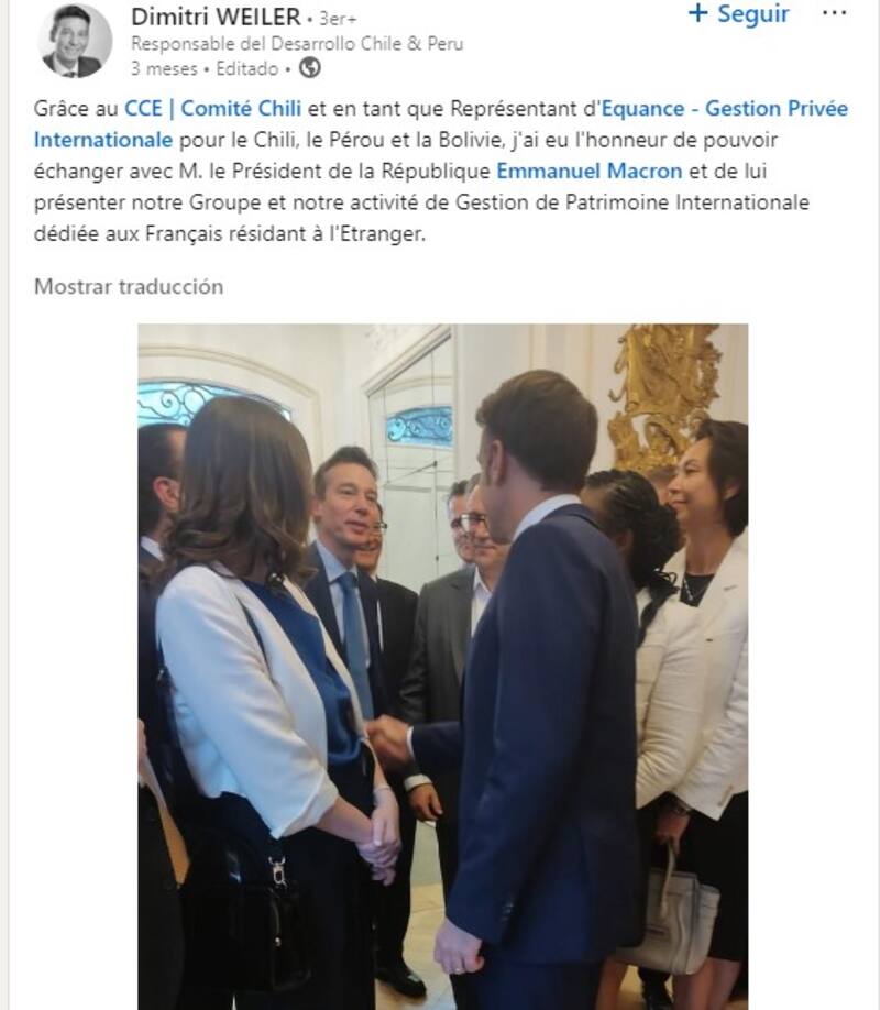 En la misma red social aparece en una foto junto al presidente de Francia, Emmanuel Macron. Se estrechan la mano en una visita del mandatario a Chile.